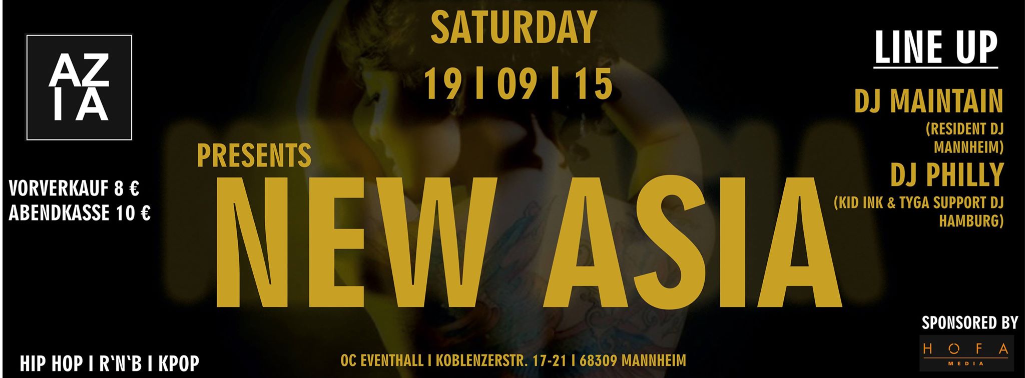 AZIA PRODUCTIONs präsentieren eine Party für alle Asien Liebhaber. Feiert mit den anderen Feierwütigen die heißeste Asiaparty in Mannheim. In der frisch renovierten OC Eventhall werden 2 Asian-DJ's alles geben. Ein DJ aus Mannheim, der Support DJ von KidInk und ein extra aus Hamburg für euch angereister DJ, legen die feinsten HipHop, R'n'B und KPoP Beats auf, damit ihr diese Nacht so schnell nicht mehr vergesst.